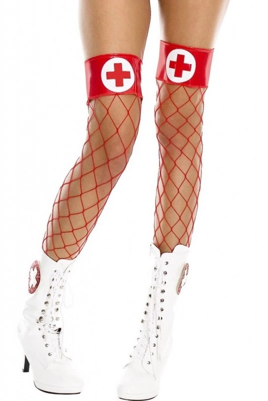 Bas Filet Rouge Jarretières Brillantes Croix Infirmière