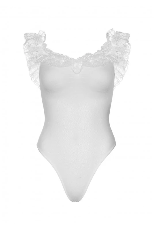 Body avec épaules découvertes bordé de volants en dentelle. Le body présente un motif de point d’esprit tissé et une fermeture à boutons-pression à l’entrejambe.