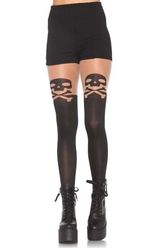 De jolis collants effet bas avec une opacité de 70 deniers sur la partie basse et couleur chair sur la partie haute. Imprimé tête de mort sur l’avant des cuisses.