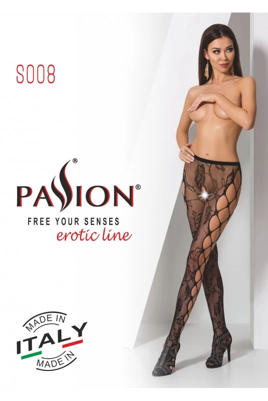 Collants ouverts en résille noire décorée de roses grimpantes, fendus sur les cotés d’un maillage provocant.
