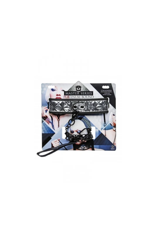 Solide Collier BDSM avec design extérieur en relief argenté et sa laisse en métal et cuir noir.