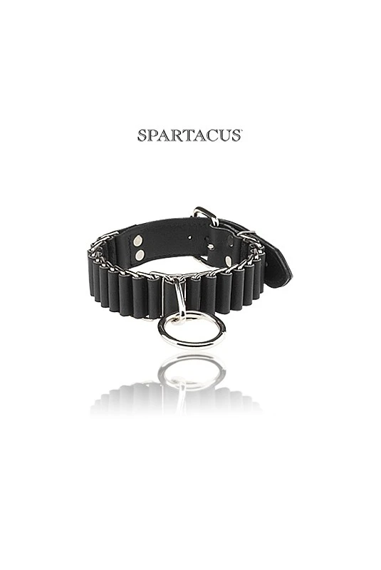 Collier de contrainte à boucle, composé d’anneaux de métal tissés par une large bande de cuir.