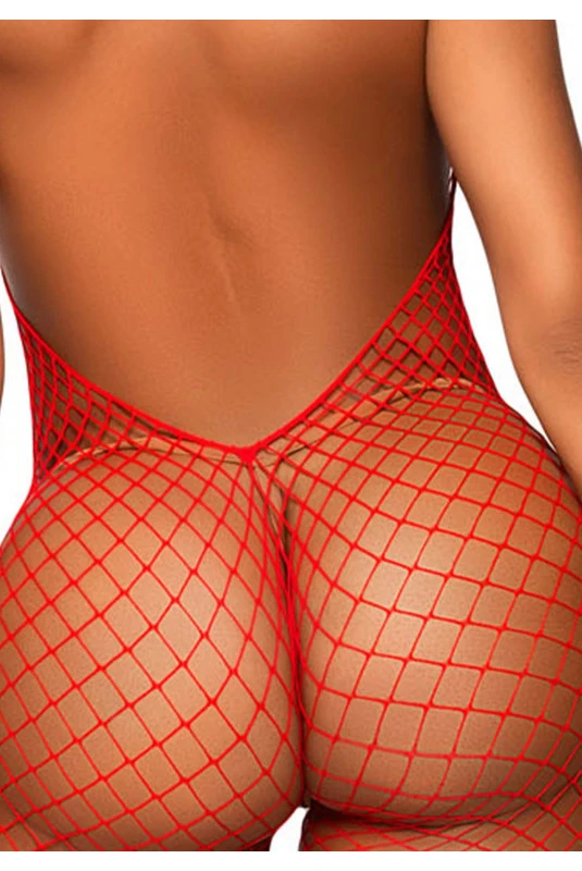 Combi BodyStocking Rouge Résille Col Licou Dos Nu
