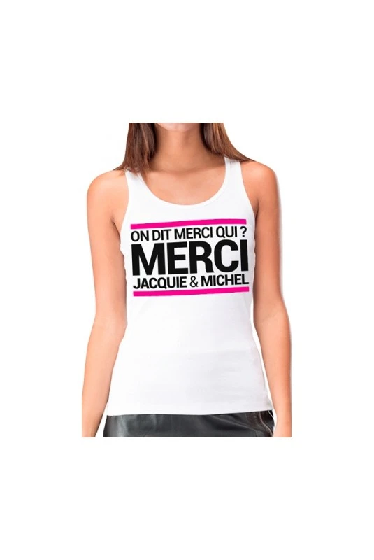 Débardeur femme, blanc, Jacquie et Michel, affichant le célèbre slogan: « On dit merci qui? » sur la poitrine.