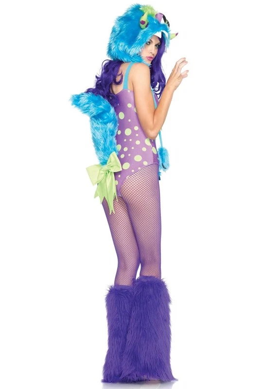 Body à pois + à l’arrière queue en peluche flexible + capuche en forme de tête de monstre assortie avec pompons en formes de pattes.