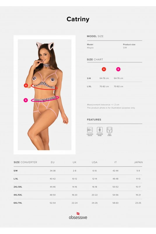 Composition : SSoutien-gorge, culotte, tour de cou : 72% polyamide, 28% élasthanne, oreilles : 100% polyester, cache-tétons : 85% PU, 10% polyester, 5% colle