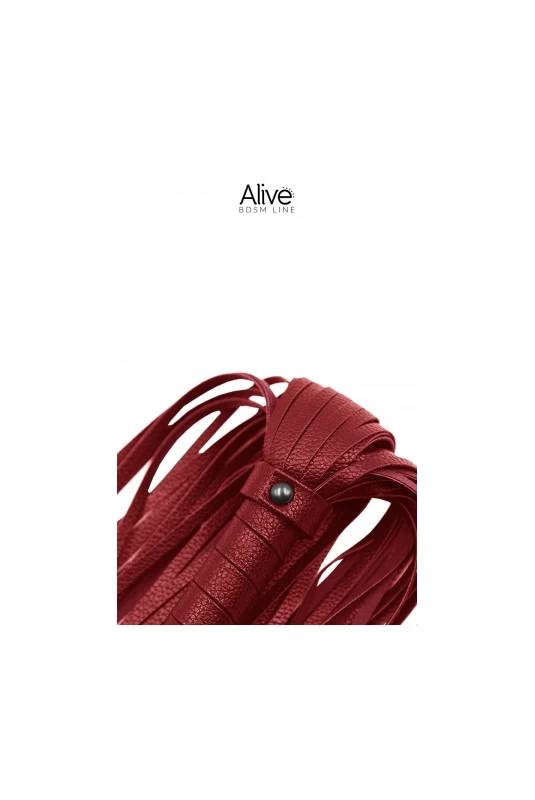 Long Fouet rouge à plusieurs lanières en cuir synthétique, idéal pour administrer de douces caresses ou des punitions plus sévères.