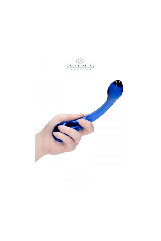 Godemiché artisanal bleu translucide en verre de borosilicate incassable, pour la pratique du sexe anal ou vaginal, dimensions 18,3 x 4,1 x 3,1 cm.