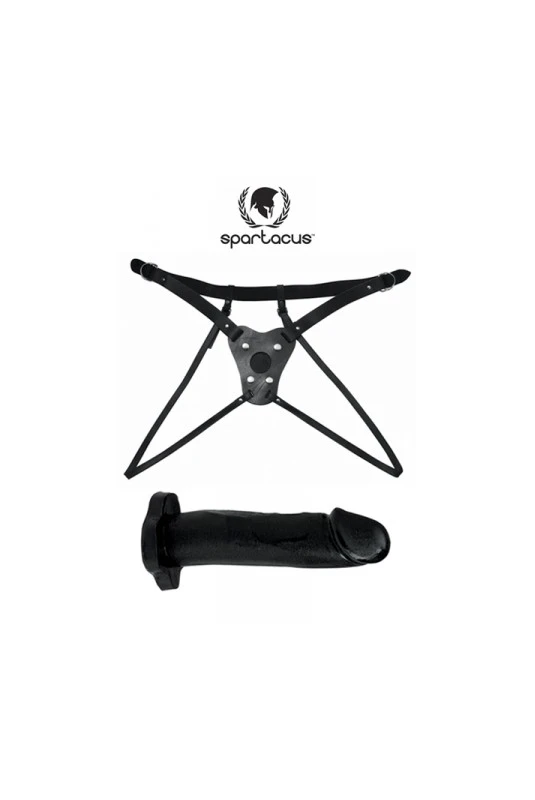 Harnais Cuir Double et Gode Noir 17,5 cm