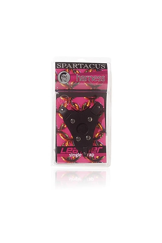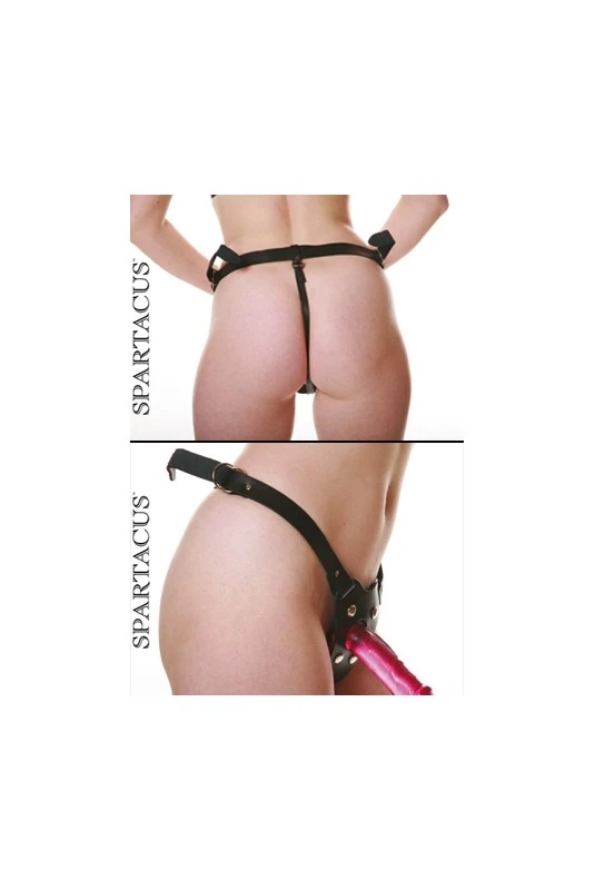 Gode ceinture Spartacus en cuir noir avec une sangle autour de la taille et une entre les jambes.