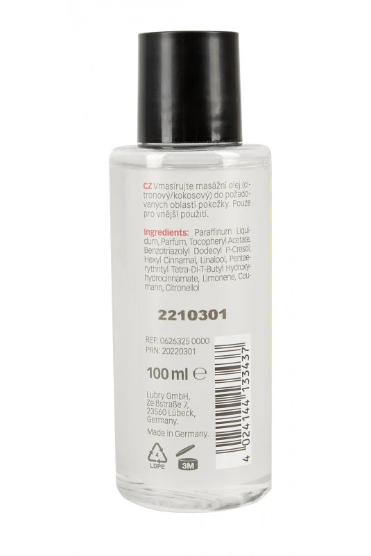 Huile de massage érotique Citron vert & Noix de coco, idéale pour des massages prolongés.