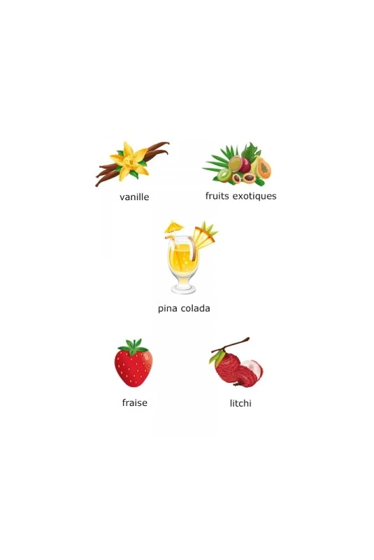 | Couleur | Chocolat, Fraise, Fruits exotiques, Vanille, Coco, pina colada, Caramel, barbe a papa, litchi, creme brulee |