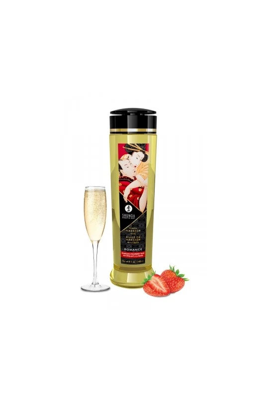 Huile de massage érotique « Romance »au vin pétillant et à la fraise pour éveiller les sens et la réceptivité amoureuse, par Shunga.