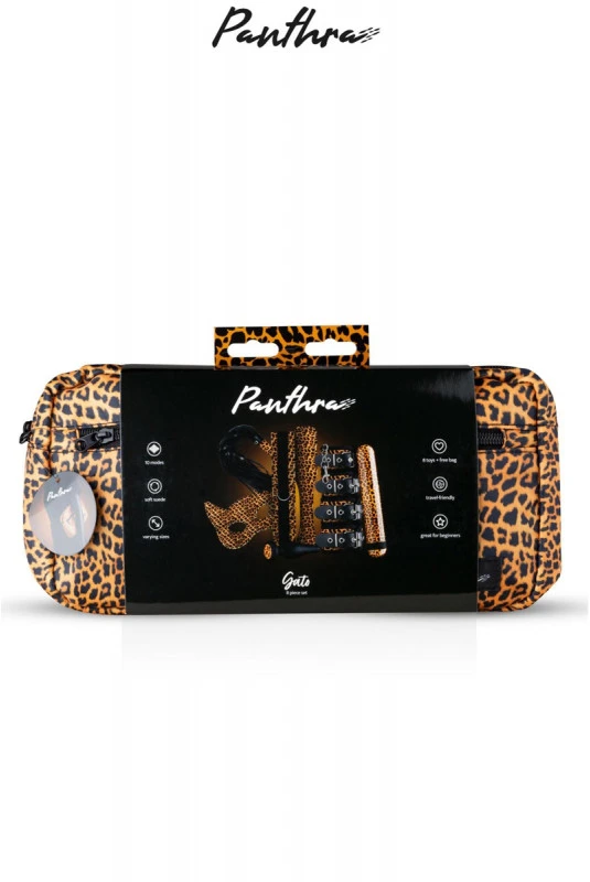 Kit de 8 accessoires BDSM haute qualité, couleur Panthère proposé dans un sac de transport assorti.