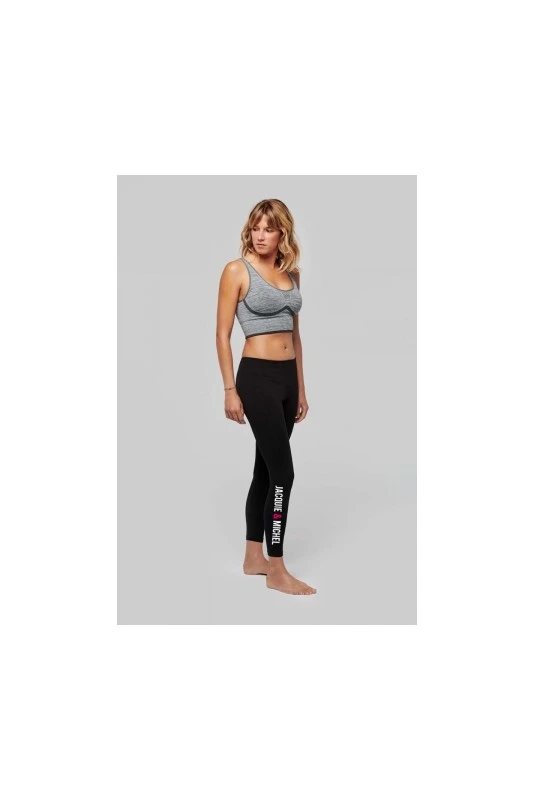 Leggings long et moulant pour femme avec inscription « Jacquie & Michel » sur la jambe droite.