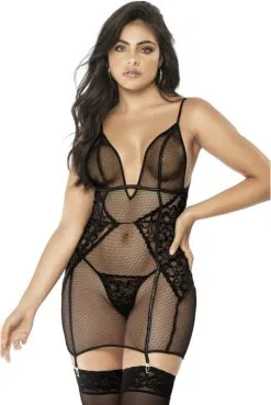 Nuisette Transparente Résille Noire à Porte Jarretelles Et String Assorti