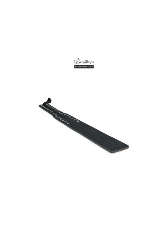 Grand paddle noir en cuir synthétique, avec rivets en métal tout le long de sa poignée.