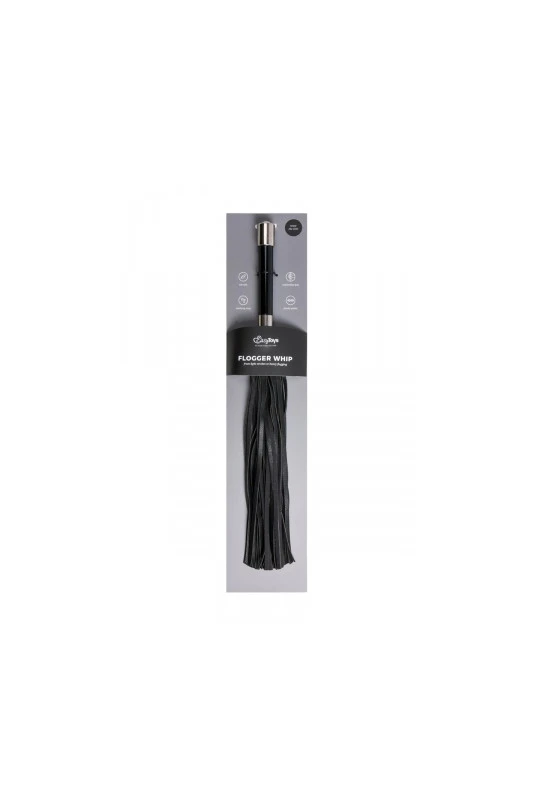 Long fouet en cuir synthétique avec poignée en métal et doté de 40 lanières.