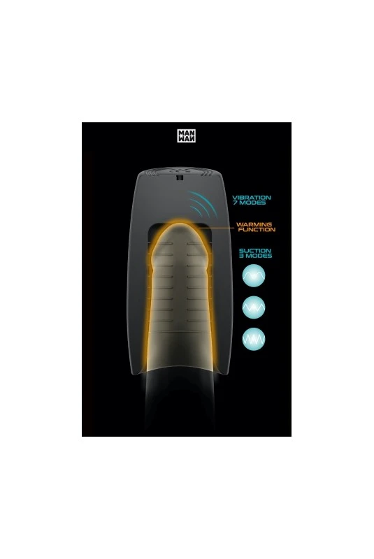 Masturbateur de qualité Premium, avec fonction chauffante, 7 modes de vibrations et 3 modes de succion jouissifs.