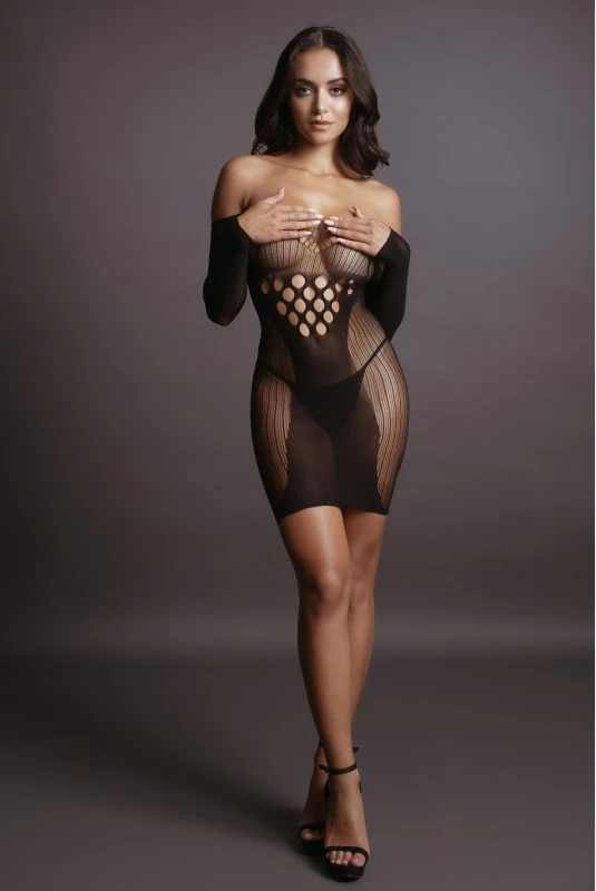 Mini robe sexy en résille fantaisie très structurée, et manches longues.