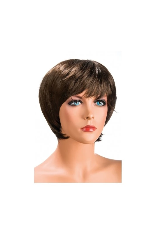 Perruque châtain aux cheveux courts ayants un aspect naturel.