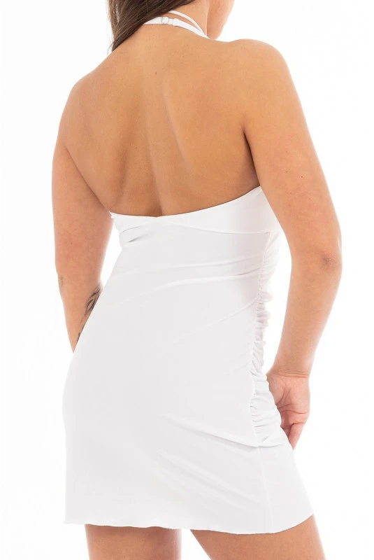 Robe courte blanche avec large décollecté et lanières croisées sur la poitrine.