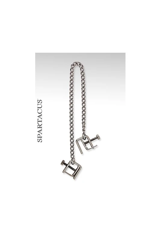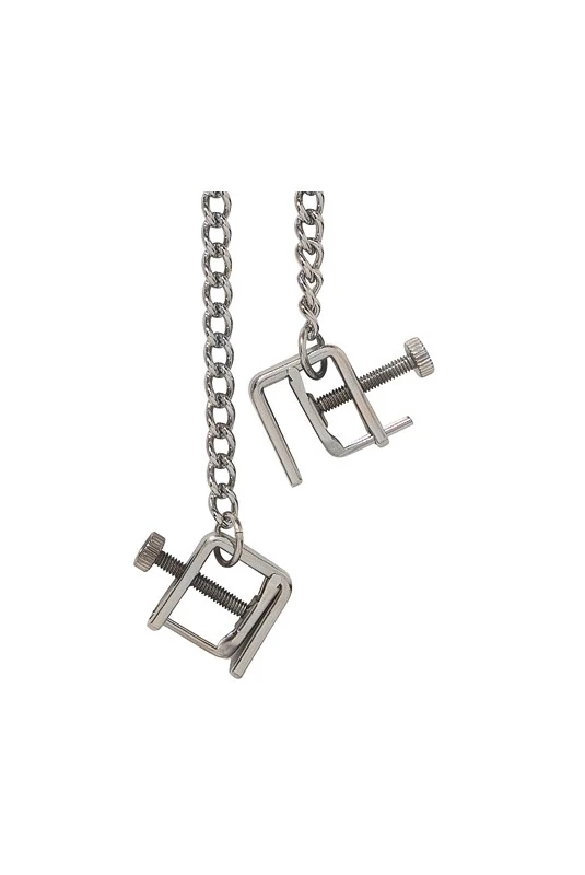 Chaîne terminée par des pinces presse ajustables par une vis, à refermer sur les tétons.