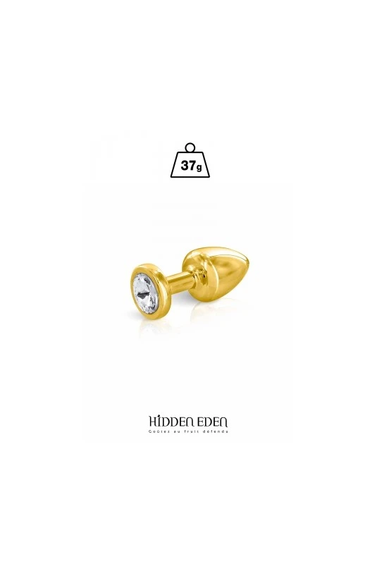 Plug anal en aluminium doré dune longueur de 5,9 cm et dun diamètre moyen de 2,5 cm. Décoré dun strass rond transparent.