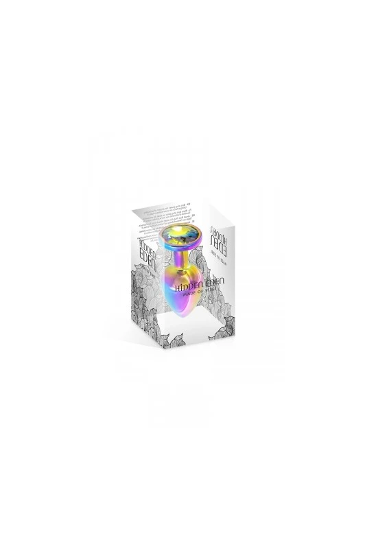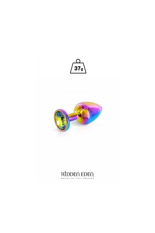 Plug anal en aluminium arc-en-ciel dune longueur de 6,1 cm et dun diamètre moyen de 2,5 cm. Décoré dun strass rond multicolore.