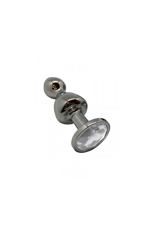 Plug anal / rosebud en métal 9,4 x 3,1 cm, avec double boule spéciale sensations et bijou strass transparent à sa base.