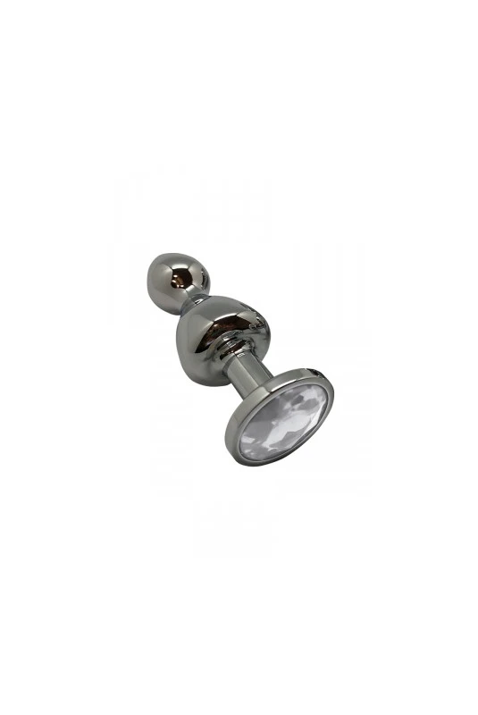 Plug anal / rosebud en métal 8,5 x 2,8 cm, avec double boule spéciale sensations et bijou strass transparent à sa base.