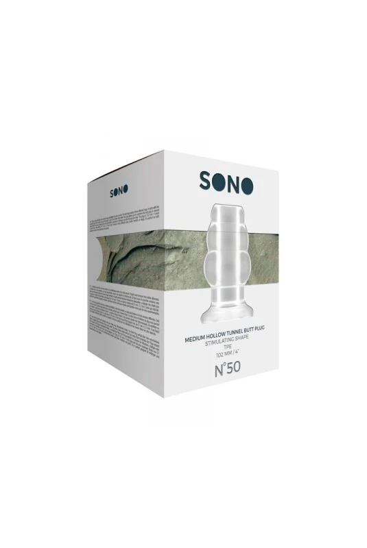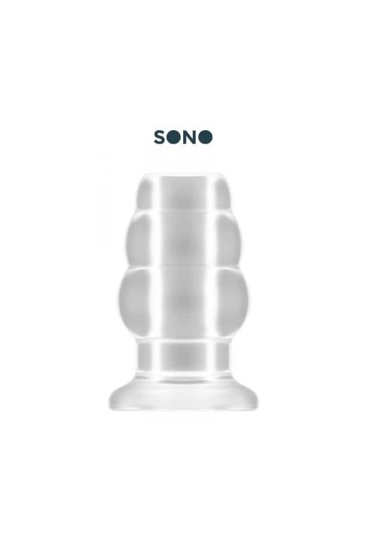 Plug anal translucide, creux au milieu, 10,2 cm de long par 5,7 cm de diamètre maxi.