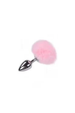 Plug anal en métal, modèle Large 9 x 4 cm, forme lisse, surmonté d’un pompon noir en fourrure synthétique.