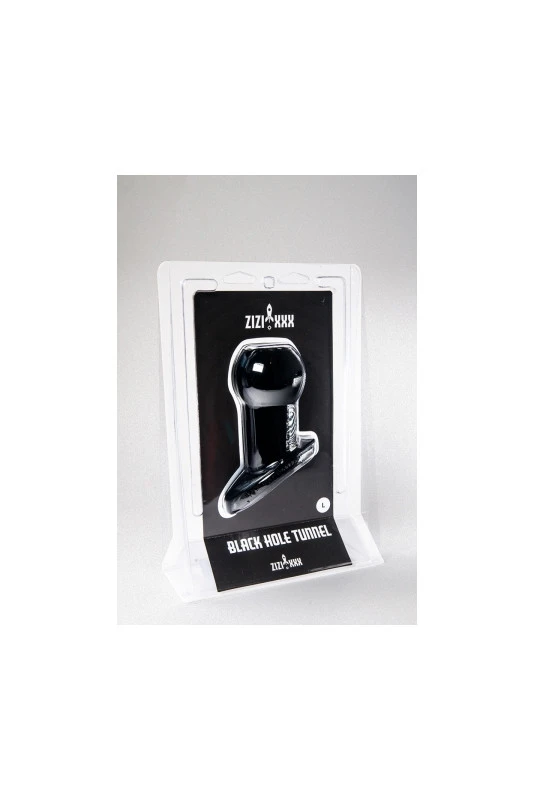 Plug anal noir en TPR, taille large, transpercé par un tunnel sur toute sa longueur.