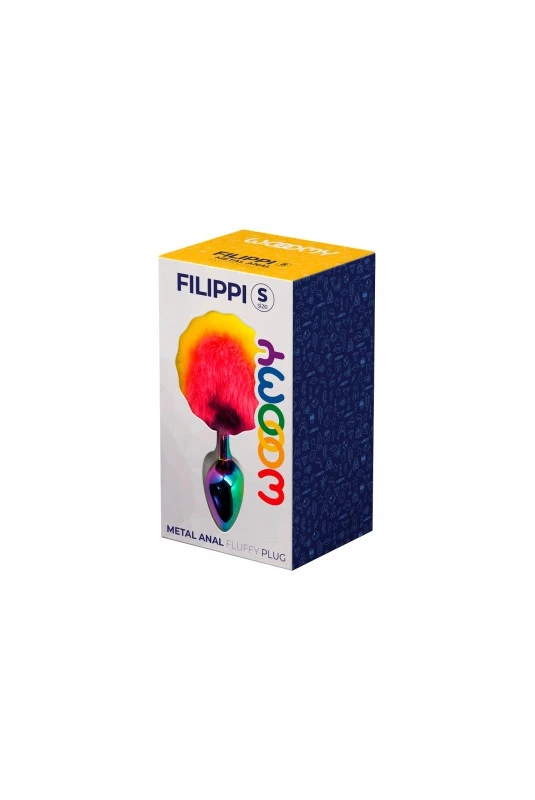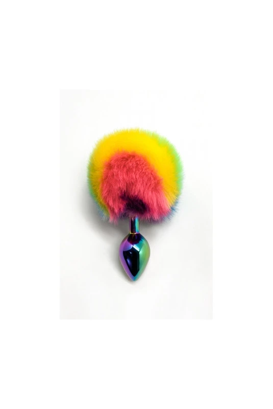Plug anal en métal, modèle Small 7 x 2,8 cm, surmonté d’un pompon en fourrure synthétique, plug et pompon couleur Raimbow Flag.