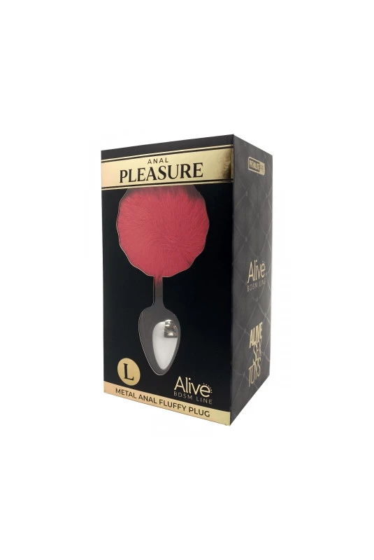 Plug anal en métal, modèle Large 9 x 4 cm, forme lisse, surmonté d’un pompon noir en fourrure synthétique.