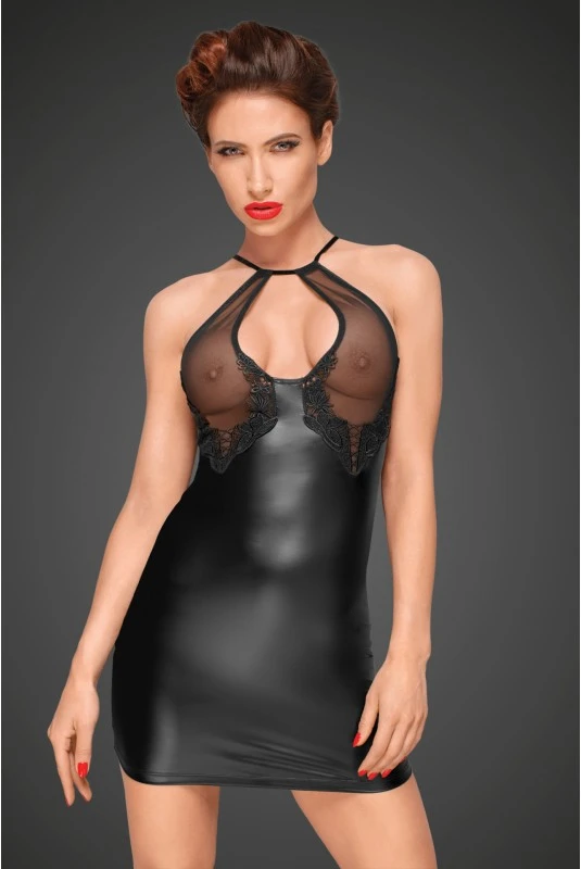 Robe fourreau courte et moulante en powerwetlook et bustier de tulle transparent rehaussé de broderies.