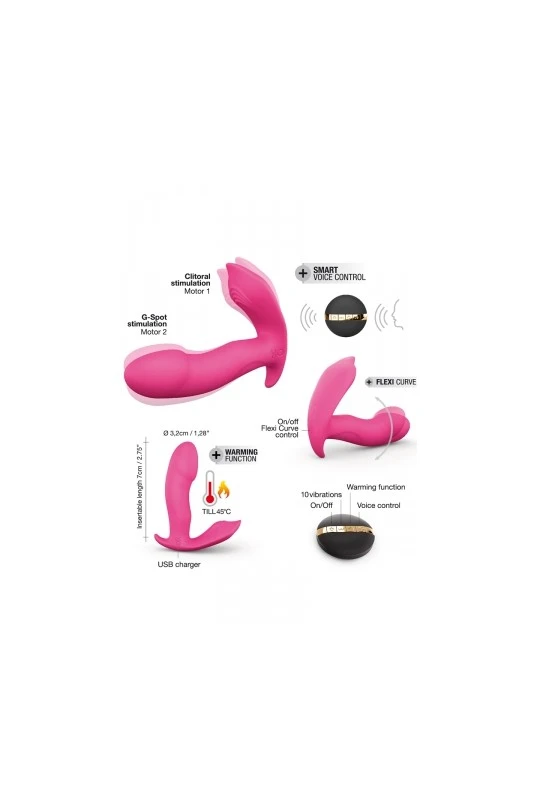 Stimule à la fois le point G, le périnée et le clitoris, fonction chauffante, télécommande sans fil et commande vocale.