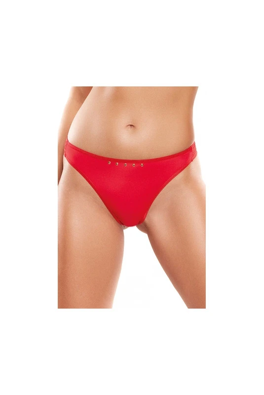 String sexy fantaisie en jersey rouge, décoré de perles dorées devant, et décolleté sur les fesses.